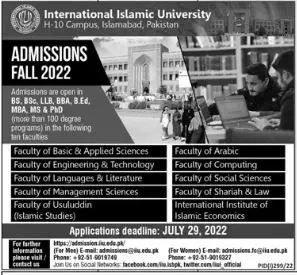 Admission in International Islamic University Islamabad announce the Contract career opportunities for the post of See Below Ad in Federal, Islamabad for the fresh and experienced candidates on Contract basis who have Check Advertisement degree. Posted date of this post is 17/07/2022 and the last date is 29/07/2022. if you are eligible for this job apply before due date.