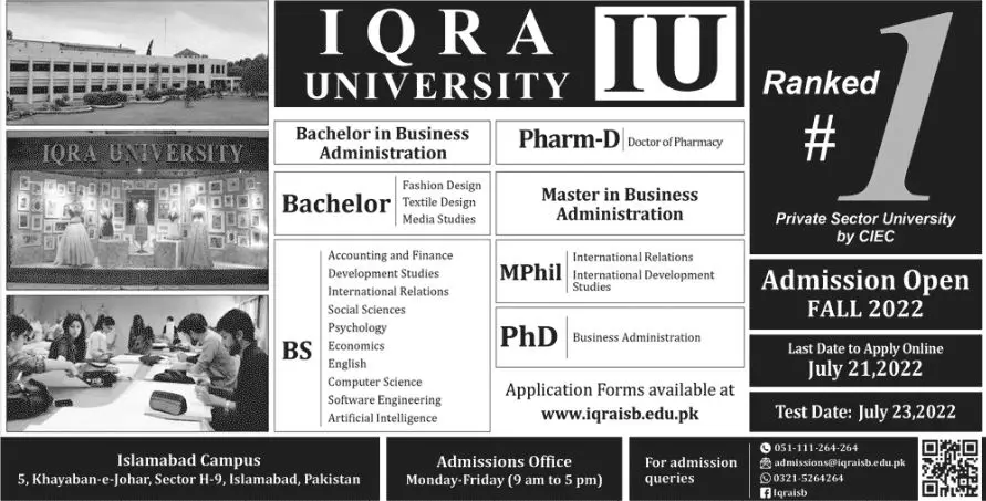 Admission In Iqra University Islamabad Campus announce the Contract career opportunities for the post of See Below Ad in Federal, Islamabad for the fresh and experienced candidates on Contract basis who have Check Advertisement degree. Posted date of this post is 15/05/2022 and the last date is 21/07/2022. if you are eligible for this job apply before due date.