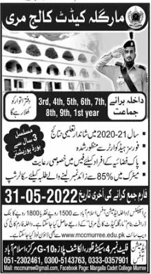 Admission in Margala Cadet College Murree announce the Contract career opportunities for the post of See Below Ad in Punjab for the fresh and experienced candidates on Contract basis who have Check Advertisement degree. Posted date of this post is 20/05/2022 and the last date is 31/05/2022. if you are eligible for this job apply before due date.