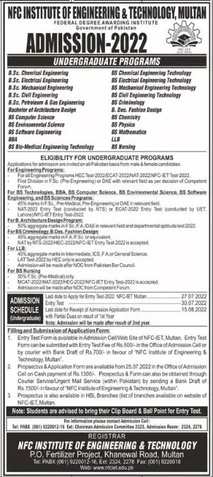 Admission in NFC institute of Engineering & Technology announce the Contract career opportunities for the post of See Below Ad in Punjab, Multan for the fresh and experienced candidates on Contract basis who have Check Advertisement degree. Posted date of this post is 19/06/2022 and the last date is 25/07/2022. if you are eligible for this job apply before due date.