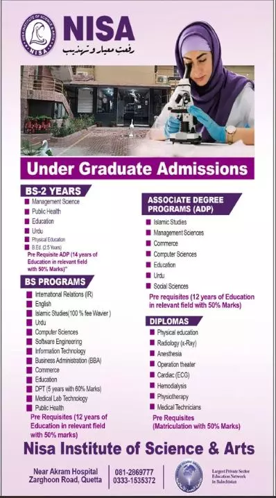 Admission in NISA Institute of Science and Arts Quetta announce the Contract career opportunities for the post of See Below Ad in Balochistan,Quetta for the fresh and experienced candidates on Contract basis who have Check Advertisement degree. Posted date of this post is 03/10/2022 and the last date is 13/10/2022. if you are eligible for this job apply before due date.