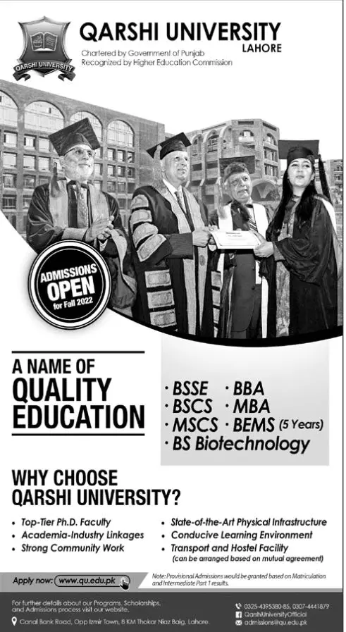 Admission in Qarshi University Lahore announce the Contract career opportunities for the post of See Below Ad in Punjab, Lahore for the fresh and experienced candidates on Contract basis who have Check Advertisement degree. Posted date of this post is 19/06/2022 and the last date is 07/07/2022. if you are eligible for this job apply before due date.