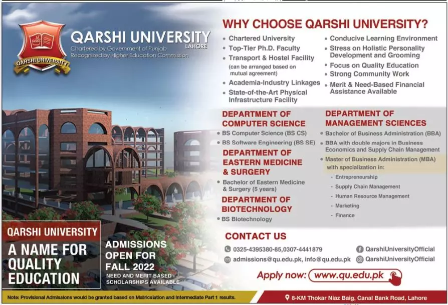 Admission in Qarshi University Lahore Punjab announce the Contract career opportunities for the post of See Below Ad in Punjab, Lahore for the fresh and experienced candidates on Contract basis who have Check Advertisement degree. Posted date of this post is 29/05/2022 and the last date is 11/06/2022. if you are eligible for this job apply before due date.