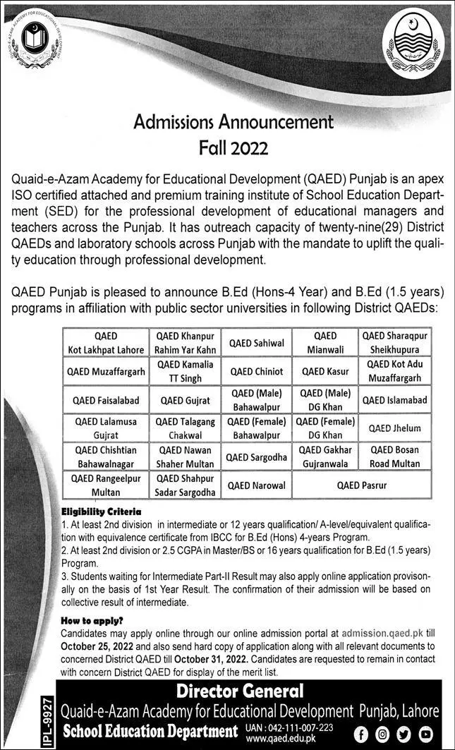 Admission in Quaid-e-Azam Academy for Educational Developmen announce the Contract career opportunities for the post of See Below Ad in Punjab, Lahore for the fresh and experienced candidates on Contract basis who have Check Advertisement degree. Posted date of this post is 05/10/2022 and the last date is 31/10/2022. if you are eligible for this job apply before due date.