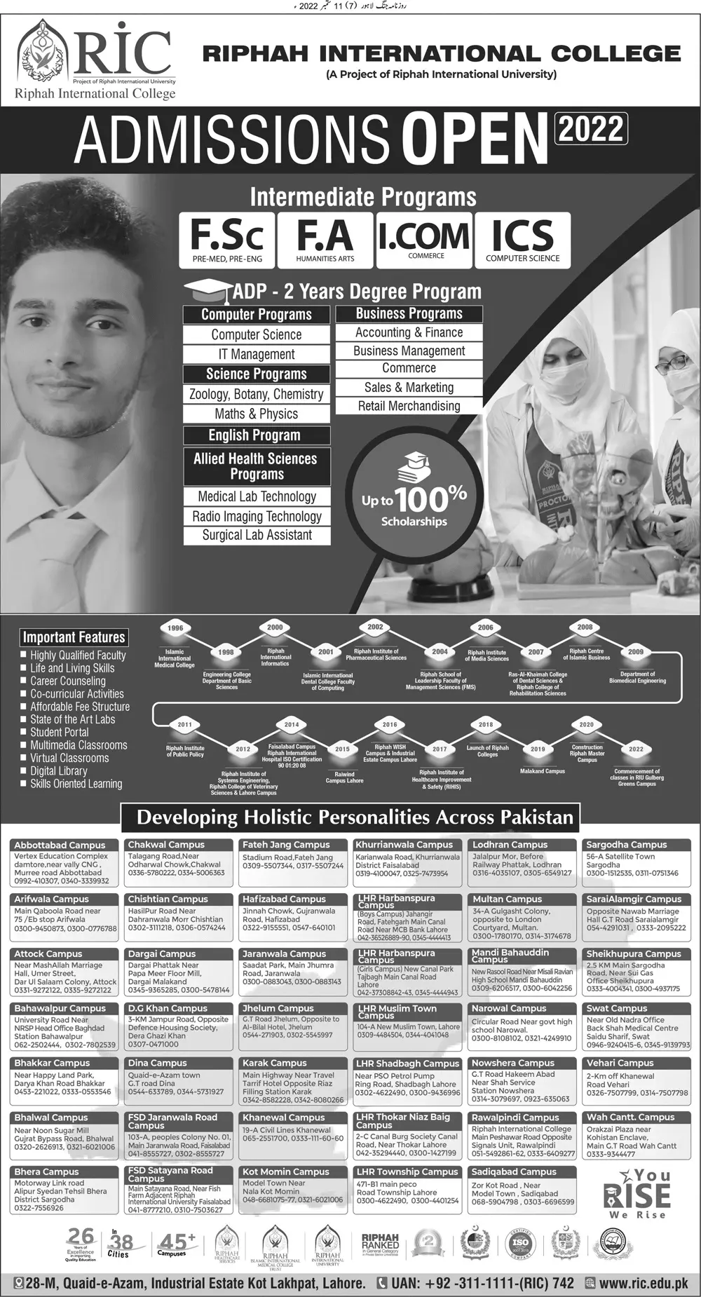 Admission in Riphah International College announce the Contract career opportunities for the post of See Below Ad in Punjab, Lahore for the fresh and experienced candidates on Contract basis who have Check Advertisement degree. Posted date of this post is 11/09/2022 and the last date is 23/09/2022. if you are eligible for this job apply before due date.