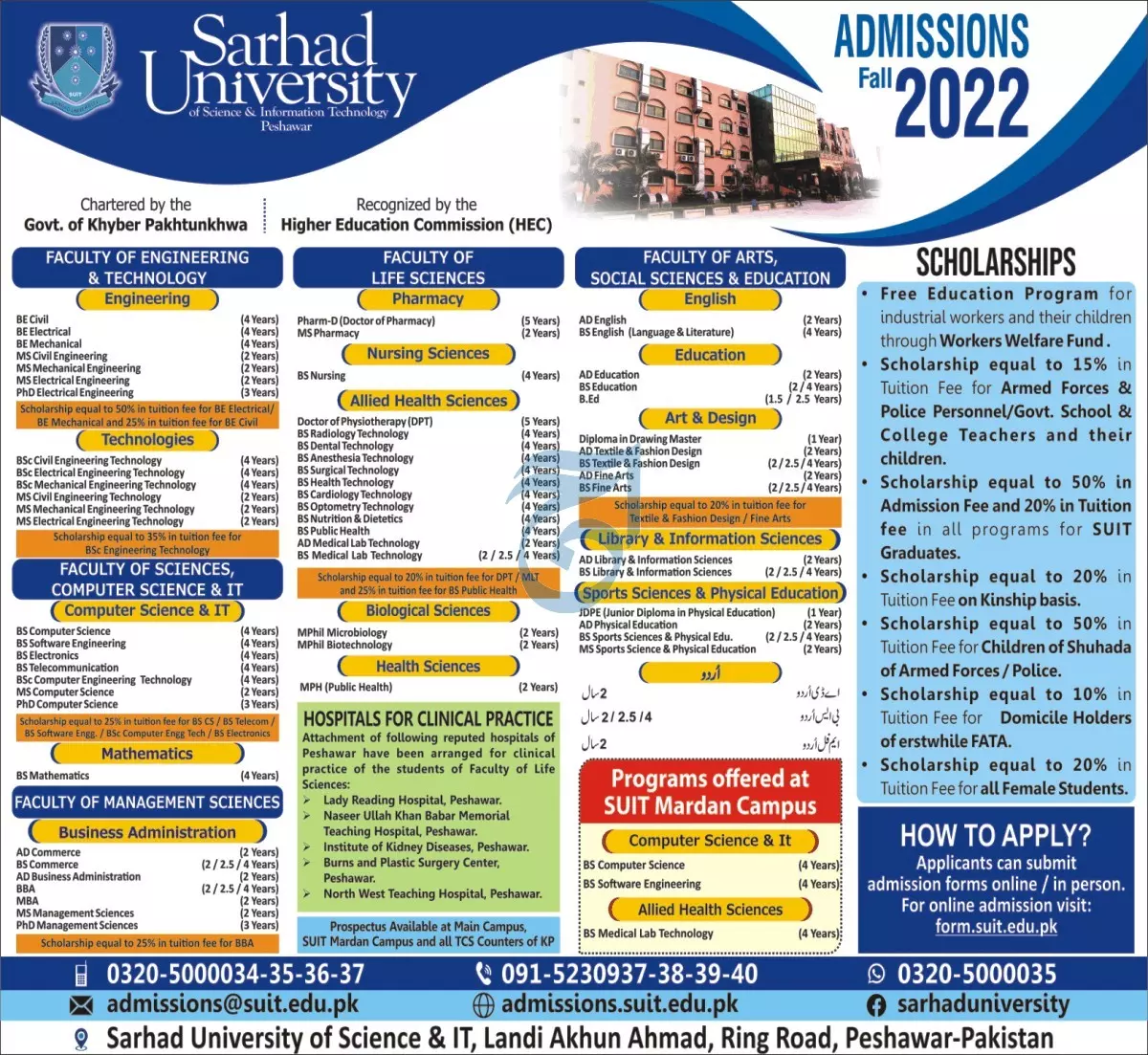 Admission in Sarhad University of Science & Information announce the Contract career opportunities for the post of See Below Ad in Khyber Pakhtunkhwa, Peshawar for the fresh and experienced candidates on Contract basis who have Check Advertisement degree. Posted date of this post is 22/08/2022 and the last date is 05/09/2022. if you are eligible for this job apply before due date.