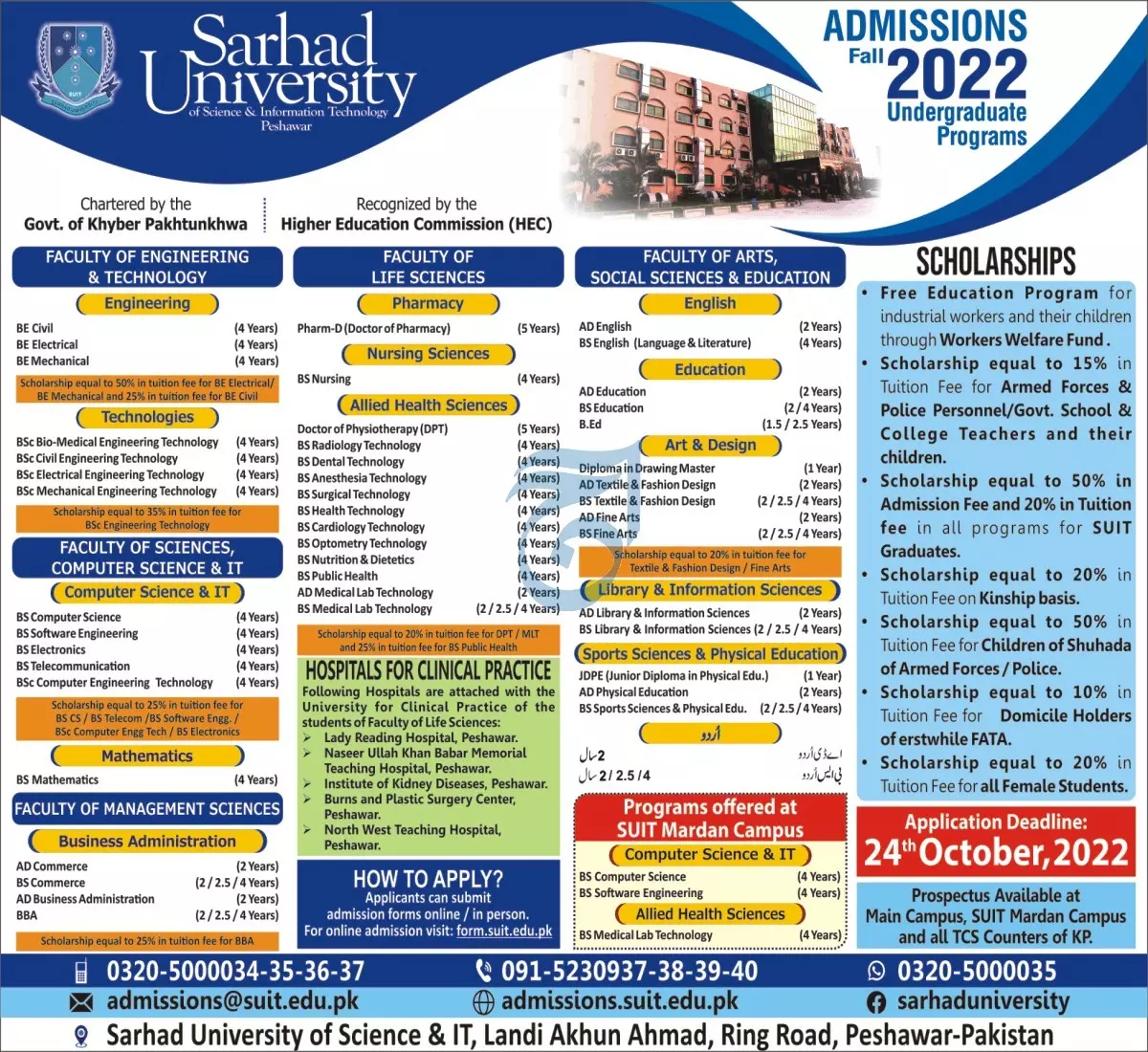 Admission in Sarhad University of Science & Information announce the Contract career opportunities for the post of See Below Ad in Khyber Pakhtunkhwa, Peshawar for the fresh and experienced candidates on Contract basis who have Check Advertisement degree. Posted date of this post is 11/10/2022 and the last date is 24/10/2022. if you are eligible for this job apply before due date.