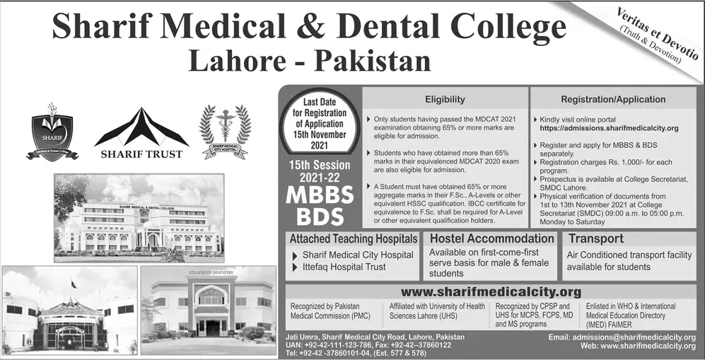 Admission in Sharif Medical and Dental College Lahore announce the Contract career opportunities for the post of See Below Ad in Punjab,Lahore for the fresh and experienced candidates on Contract basis who have Check Advertisement degree. Posted date of this post is 01/11/2021 and the last date is 13/11/2021. if you are eligible for this job apply before due date.