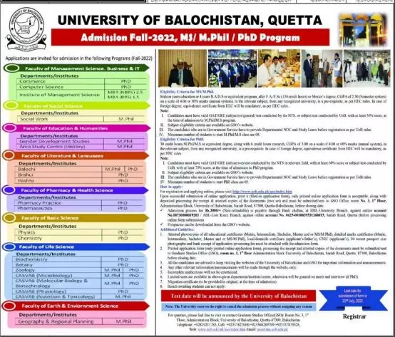 admission in University of baochistan announce the Contract career opportunities for the post of See Below Ad in Balochistan, Quetta for the fresh and experienced candidates on Contract basis who have Check Advertisement degree. Posted date of this post is 10/07/2022 and the last date is 22/07/2022. if you are eligible for this job apply before due date.