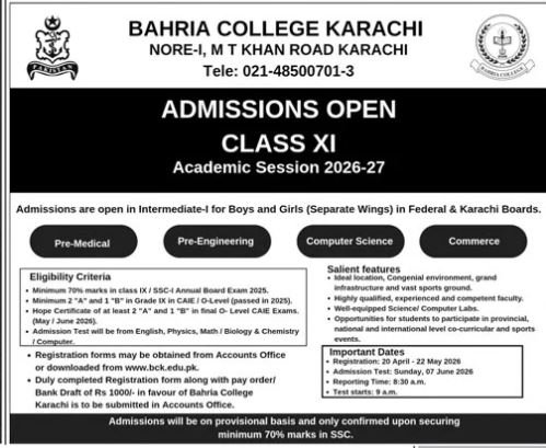 Bahria college karsaz announce the latest in different programs, details are mentioned in See Below Ad . Students from Sindh, Karachi and other provinces of Pakistan, can apply for the . Students awaiting for the s in Bahria college karsaz can apply according the given criteria which is mentioned in the advertisement. Students awaiting results may also apply. Advertisement date is 19/04/2026 and the last date of the admission is 21/04/2026