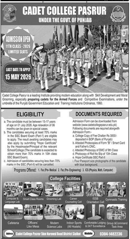Cadet College Pasrur announce the latest in different programs, details are mentioned in See Below Ad . Students from Punjab and other provinces of Pakistan, can apply for the . Students awaiting for the s in Cadet College Pasrur can apply according the given criteria which is mentioned in the advertisement. Students awaiting results may also apply. Advertisement date is 04/04/2026 and the last date of the admission is 15/05/2026