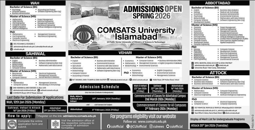 COMSATS University Islamabad announce the latest in different programs, details are mentioned in See Below Ad . Students from Federal, Islamabad and other provinces of Pakistan, can apply for the . Students awaiting for the s in COMSATS University Islamabad can apply according the given criteria which is mentioned in the advertisement. Students awaiting results may also apply. Advertisement date is 11/01/2026 and the last date of the admission is 12/01/2026