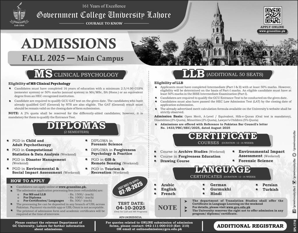 Government College University Lahore announce the latest in different programs, details are mentioned in See Below Ad . Students from Punjab, Lahore and other provinces of Pakistan, can apply for the . Students awaiting for the s in Government College University Lahore can apply according the given criteria which is mentioned in the advertisement. Students awaiting results may also apply. Advertisement date is 26/09/2025 and the last date of the admission is 02/10/2025