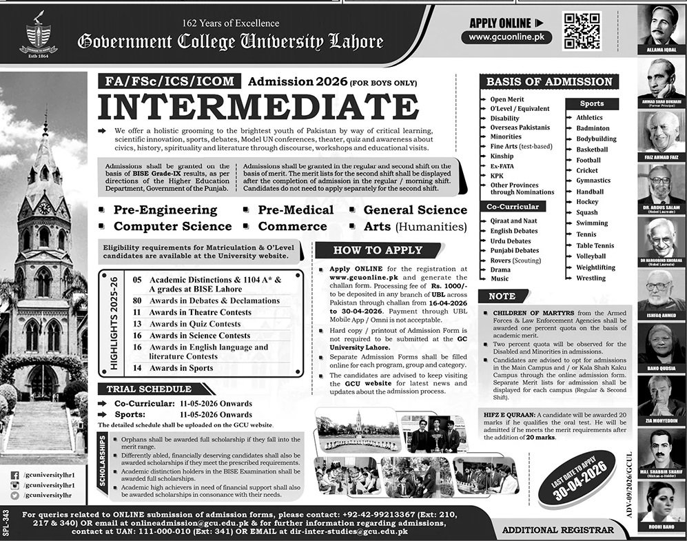 Government College University Lahore announce the latest Admission in different programs, details are mentioned in See Below Ad. Students from Punjab,Lahore and other provinces of Pakistan, can apply for the Admission. Students awaiting for the Admissions in Government College University Lahore can apply according the given criteria which is mentioned in the advertisement. Students awaiting results may also apply. Advertisement date is 17/04/2026 and the last date of the admission is 30/04/2026