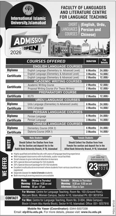 International Islamic University Islamabad announce the latest in different programs, details are mentioned in See Below Ad . Students from Federal, Islamabad and other provinces of Pakistan, can apply for the . Students awaiting for the s in International Islamic University Islamabad can apply according the given criteria which is mentioned in the advertisement. Students awaiting results may also apply. Advertisement date is 11/01/2026 and the last date of the admission is 23/01/2026