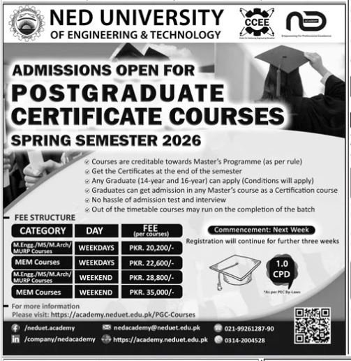 NED University of Engineering and Technology announce the latest in different programs, details are mentioned in See Below Ad . Students from Sindh, Karachi and other provinces of Pakistan, can apply for the . Students awaiting for the s in NED University of Engineering and Technology can apply according the given criteria which is mentioned in the advertisement. Students awaiting results may also apply. Advertisement date is 04/01/2026 and the last date of the admission is 29/01/2026