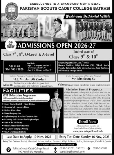 Pakistan Scouts Cadet College Batrasi Mansehra announce the latest in different programs, details are mentioned in See Below Ad . Students from Khyber Pakhtunkhwa, Mansehra and other provinces of Pakistan, can apply for the . Students awaiting for the s in Pakistan Scouts Cadet College Batrasi Mansehra can apply according the given criteria which is mentioned in the advertisement. Students awaiting results may also apply. Advertisement date is 31/08/2025 and the last date of the admission is 10/11/2025