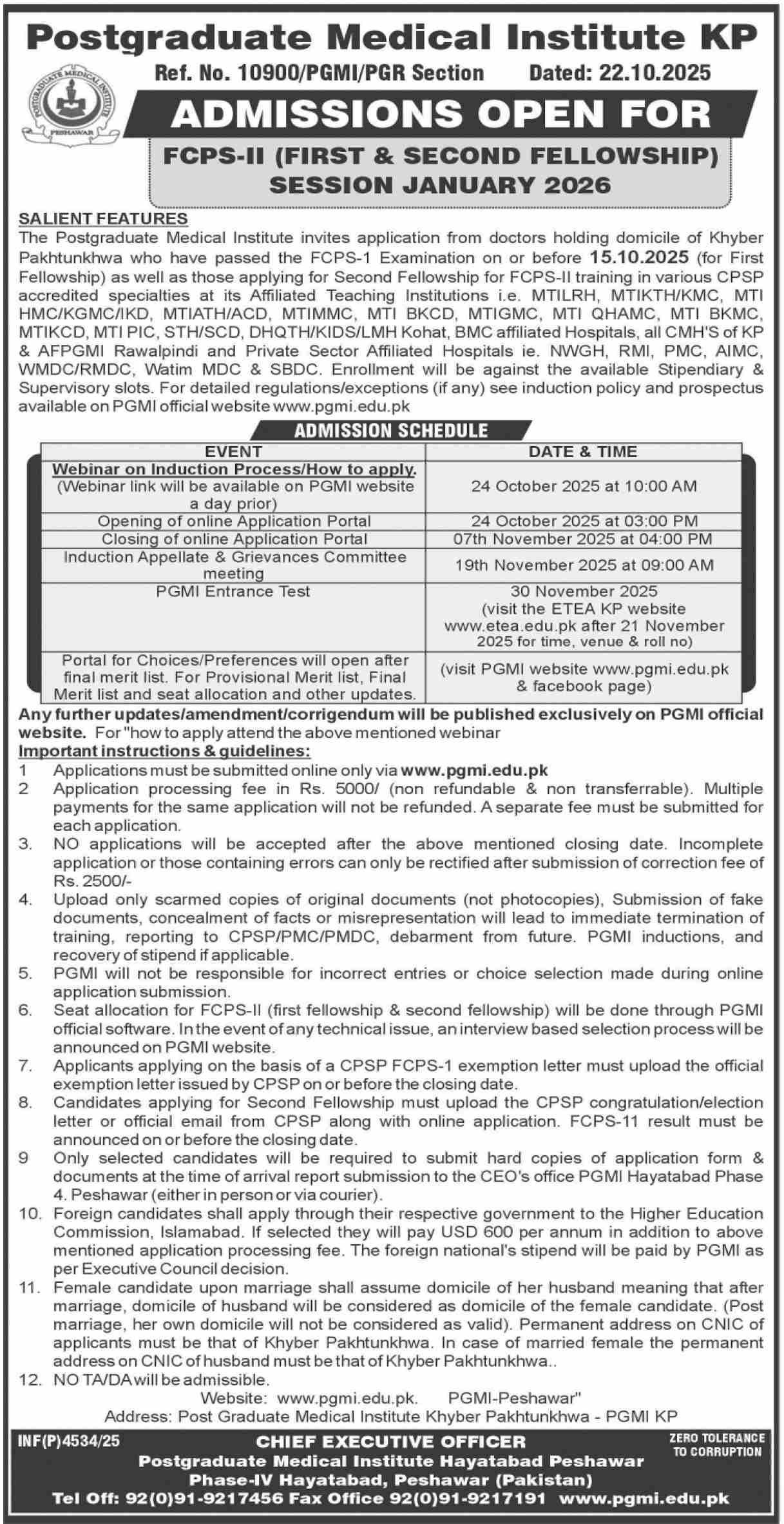 Jinnah Postgruate Medical Centre Karachi announce the latest in different programs, details are mentioned in See Below Ad . Students from Khyber Pakhtunkhwa, Peshawar and other provinces of Pakistan, can apply for the . Students awaiting for the s in Jinnah Postgruate Medical Centre Karachi can apply according the given criteria which is mentioned in the advertisement. Students awaiting results may also apply. Advertisement date is 26/10/2025 and the last date of the admission is 08/11/2025