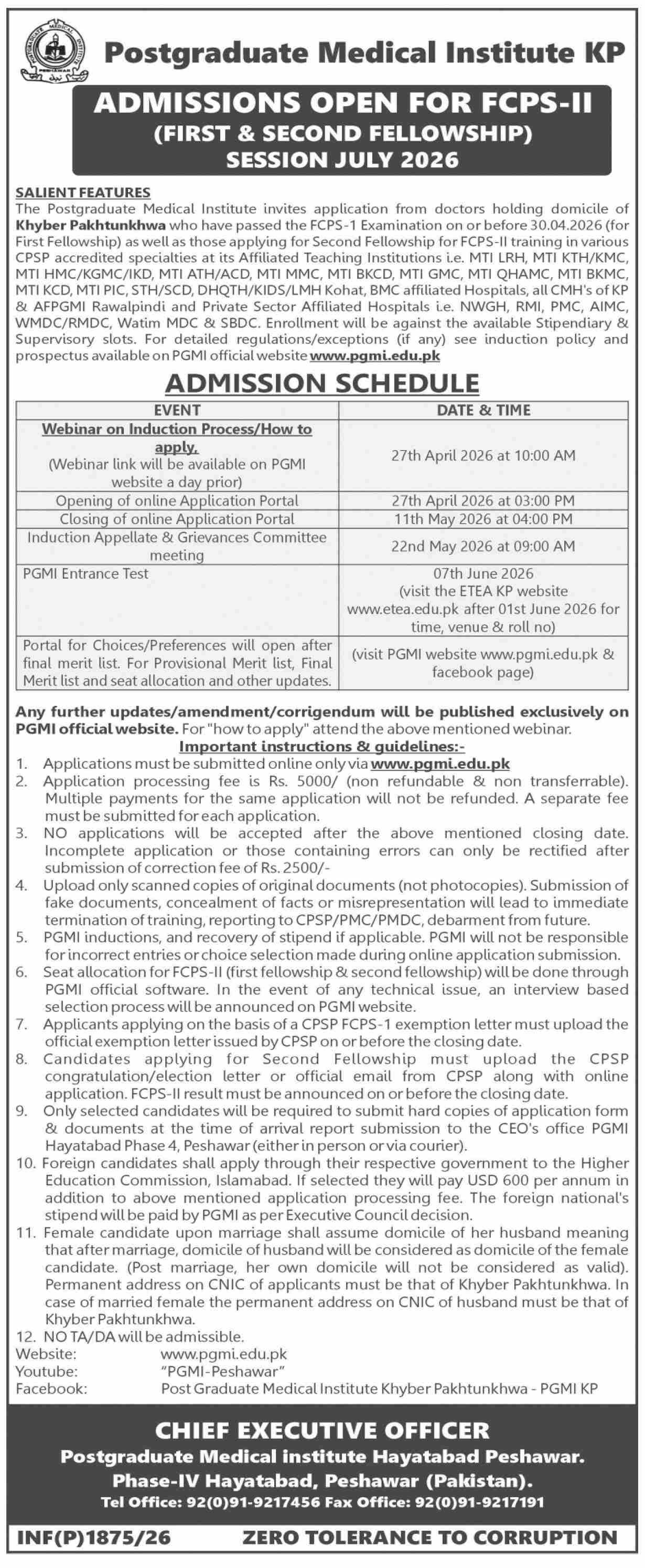 Admission Open in Postgrauted Medical Institute Kp 2026 announce the Contract career opportunities for the post of See Below Ad in Khyber Pakhtunkhwa for the fresh and experienced candidates on Contract basis who have Check Advertisement degree. Posted date of this post is 28/04/2026 and the last date is 09/05/2026. if you are eligible for this job apply before due date.