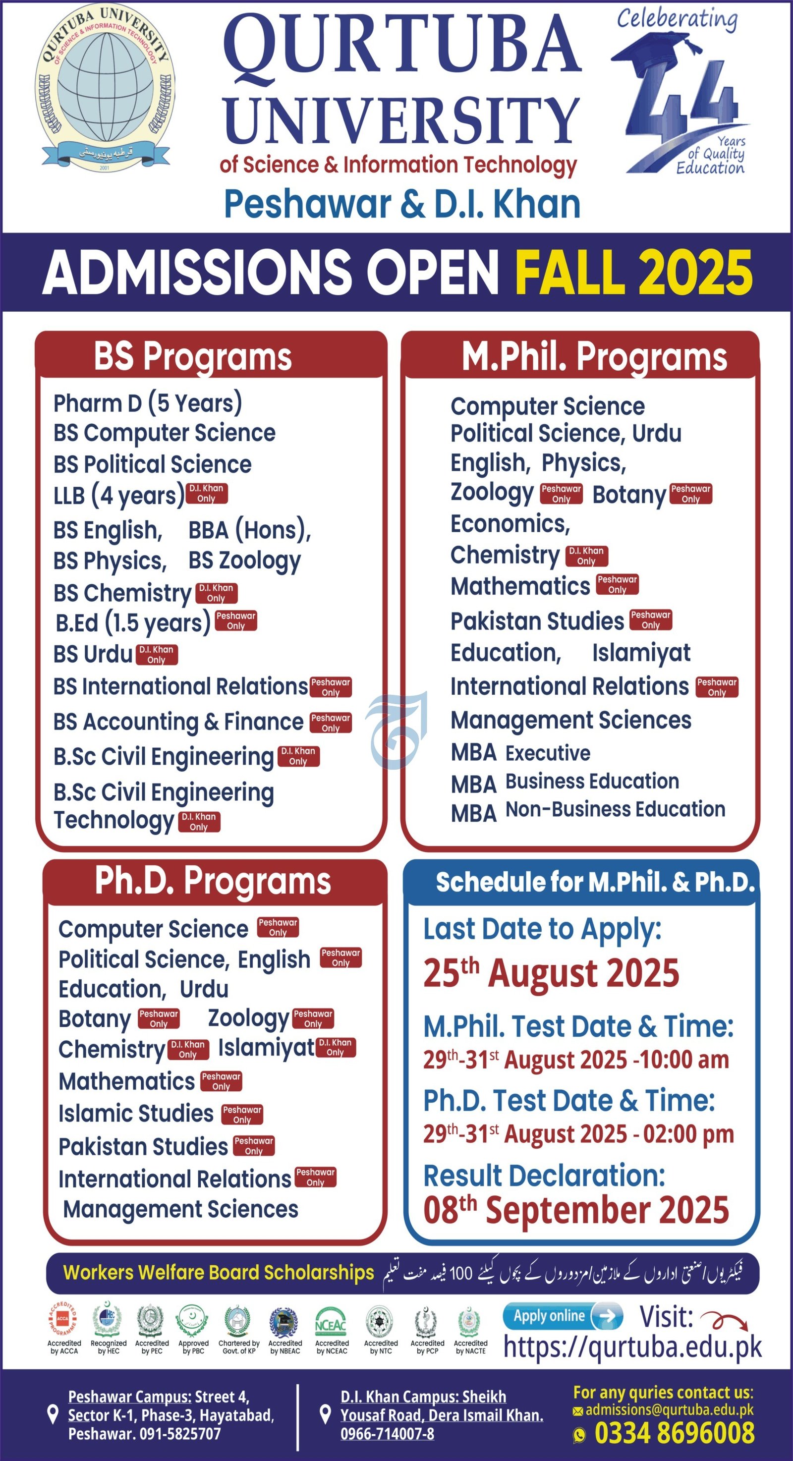 Admission Open in Qurtuba University Peshawar 2025 announce the Contract career opportunities for the post of See Below Ad in Khyber Pakhtunkhwa, Peshawar for the fresh and experienced candidates on Contract basis who have Check Advertisement degree. Posted date of this post is 15/08/2025 and the last date is 25/08/2025. if you are eligible for this job apply before due date.