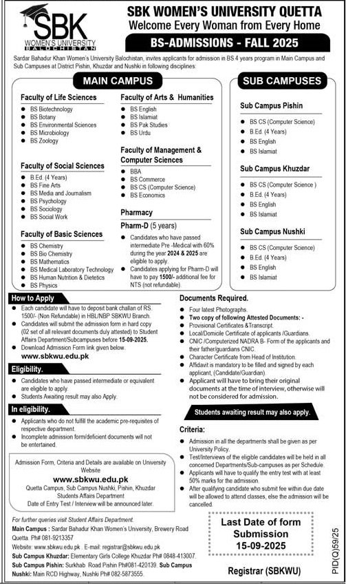 Admission Open in Sardar Bahaudar Khan Women University 2025 announce the Contract career opportunities for the post of See Below Ad in Balochistan, Quetta for the fresh and experienced candidates on Contract basis who have Check Advertisement degree. Posted date of this post is 03/08/2025 and the last date is 15/09/2025. if you are eligible for this job apply before due date.