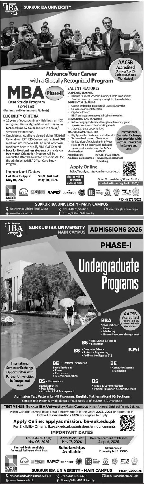 Sukkur IBA University announce the latest in different programs, details are mentioned in See Below Ad . Students from Sindh, Sukkur and other provinces of Pakistan, can apply for the . Students awaiting for the s in Sukkur IBA University can apply according the given criteria which is mentioned in the advertisement. Students awaiting results may also apply. Advertisement date is 12/04/2026 and the last date of the admission is 05/05/2026