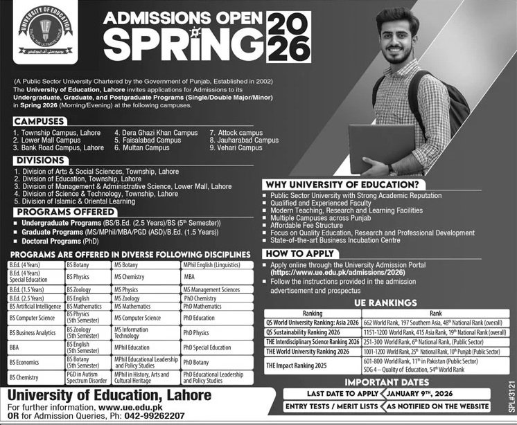 University of Education Lahore announce the latest in different programs, details are mentioned in See Below Ad . Students from Punjab, Lahore and other provinces of Pakistan, can apply for the . Students awaiting for the s in University of Education Lahore can apply according the given criteria which is mentioned in the advertisement. Students awaiting results may also apply. Advertisement date is 28/12/2025 and the last date of the admission is 10/01/2026