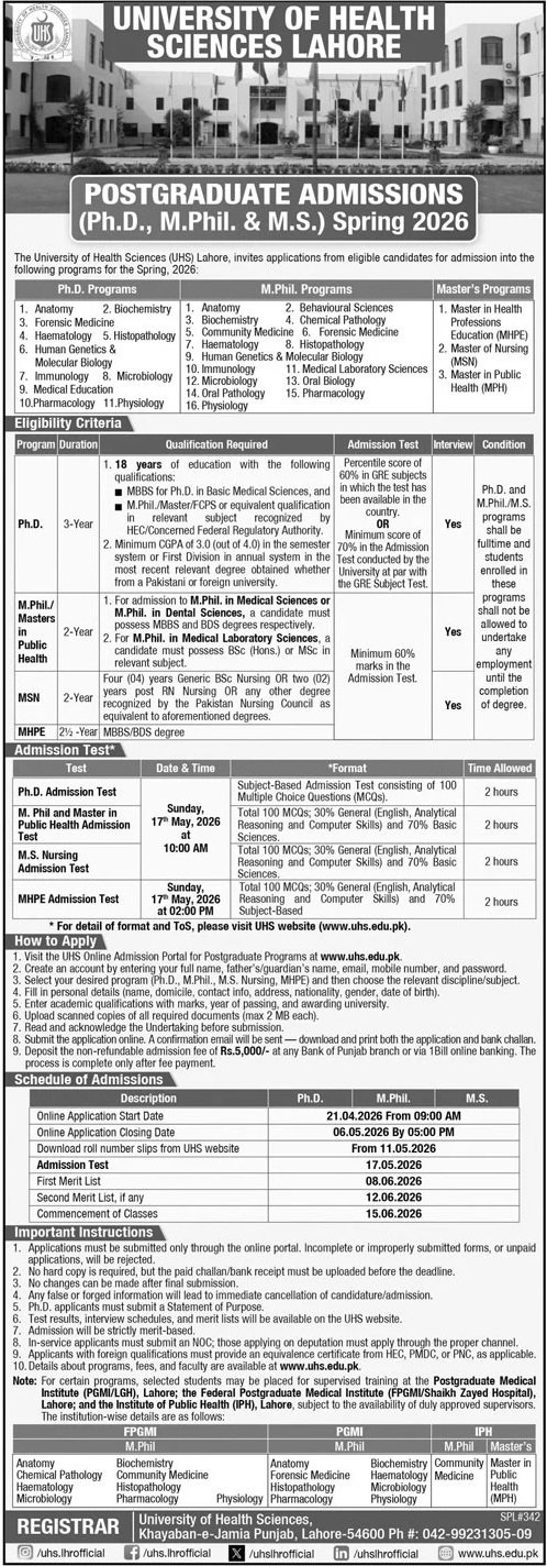 Admission Open in University of Health Sciences Lahore 2026 announce the Contract career opportunities for the post of See Below Ad in Punjab, Lahore for the fresh and experienced candidates on Contract basis who have Check Advertisement degree. Posted date of this post is 17/04/2026 and the last date is 06/05/2026. if you are eligible for this job apply before due date.
