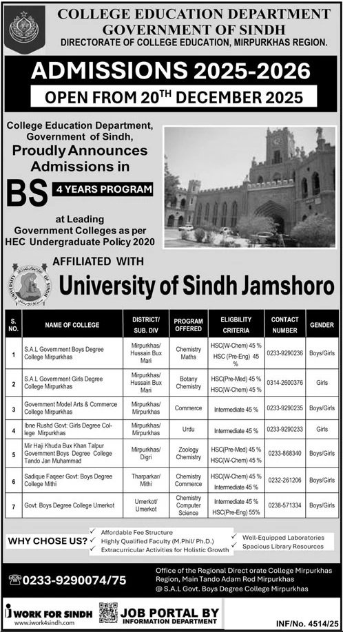 University of Sindh Jamshoro announce the latest Admission in different programs, details are mentioned in See Below Ad . Students from Sindh, Jamshoro and other provinces of Pakistan, can apply for the Admission. Students awaiting for the Admissions in University of Sindh Jamshoro can apply according the given criteria which is mentioned in the advertisement. Students awaiting results may also apply. Advertisement date is 30/12/2025 and the last date of the admission is 10/01/2026