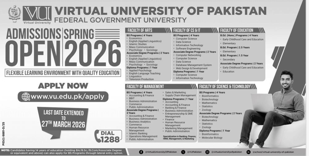 Virtual University of Pakistan announce the latest Admission in different programs, details are mentioned in See Below Ad. Students from Sindh,Karachi and other provinces of Pakistan, can apply for the Admission. Students awaiting for the Admissions in Virtual University of Pakistan can apply according the given criteria which is mentioned in the advertisement. Students awaiting results may also apply. Advertisement date is 22/02/2026 and the last date of the admission is 27/03/2026