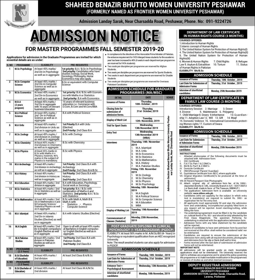 Admission Shaheed Benazir Bhutto Women University Peshawar