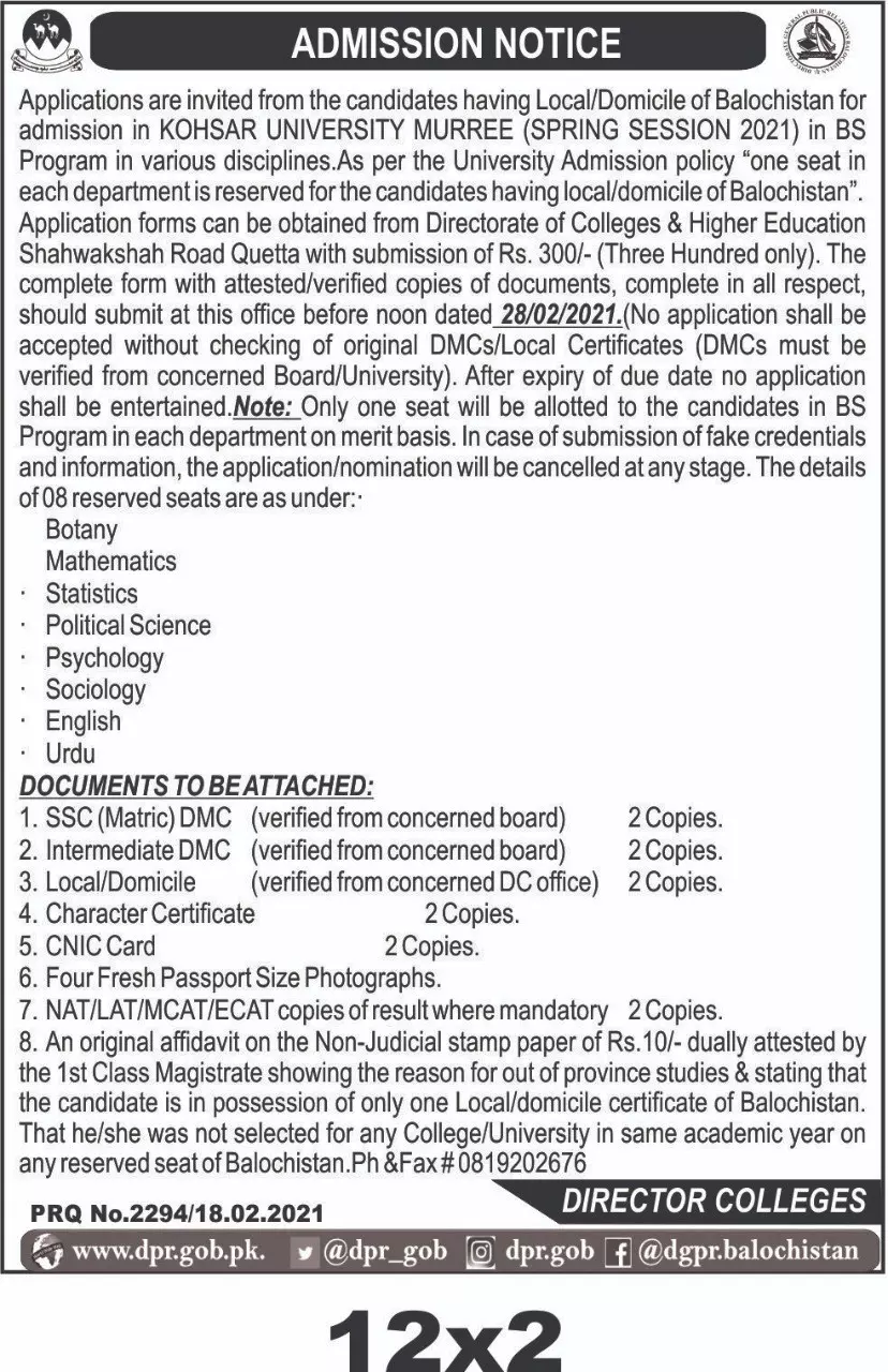 Admissions Balochistan Reserved Seat Kohsar University announce the Permanent career opportunities for the post of See Below Ad in Balochistan for the fresh and experienced candidates on Permanent basis who have Check Advertisement degree. Posted date of this post is 19/02/2021 and the last date is 28/02/2021. if you are eligible for this job apply before due date.