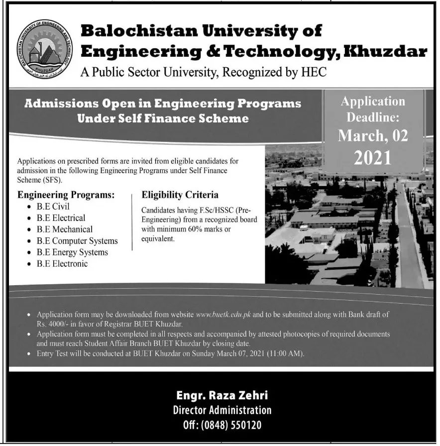 Admissions Balochistan University of Engineering & Technlogy announce the Permanent career opportunities for the post of See Below Ad in Balochistan for the fresh and experienced candidates on Permanent basis who have Check Advertisement degree. Posted date of this post is 17/02/2021 and the last date is 02/03/2021. if you are eligible for this job apply before due date.