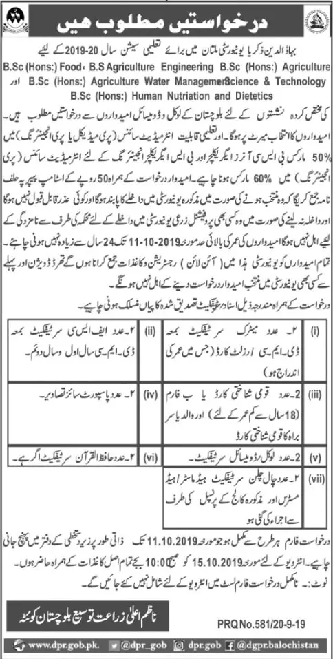 Admissions BZU University Multan Balochistan Quota announce the Permanent career opportunities for the post of See Below Ad in Balochistan for the fresh and experienced candidates on Permanent basis who have Check Advertisement degree. Posted date of this post is 22/09/2019 and the last date is 11/10/2019. if you are eligible for this job apply before due date.