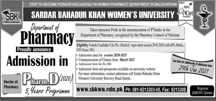 Admissions In Sardar Bahadur Khan Women University Quetta announce the Permanent career opportunities for the post of See Below Ad in Balochistan,Quetta for the fresh and experienced candidates on Permanent basis who have Check Advertisement degree. Posted date of this post is 01/01/2021 and the last date is 29/01/2021. if you are eligible for this job apply before due date.