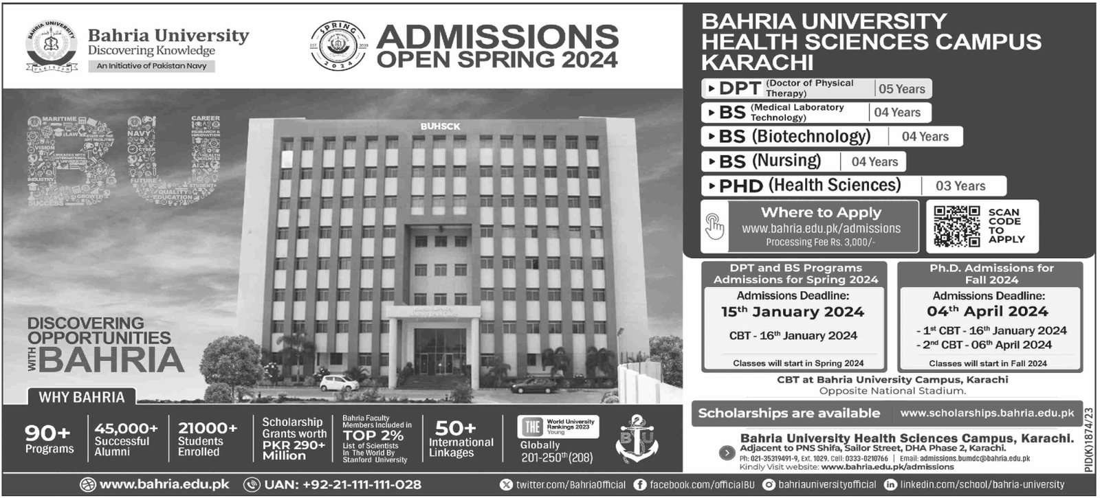 Admissions Open in Bahria Univeristy Health Sciences Karachi announce the Contract career opportunities for the post of See Below Ad in Sindh, Karachi for the fresh and experienced candidates on Contract basis who have Check Advertisement degree. Posted date of this post is 31/12/2023 and the last date is 15/01/2024. if you are eligible for this job apply before due date.