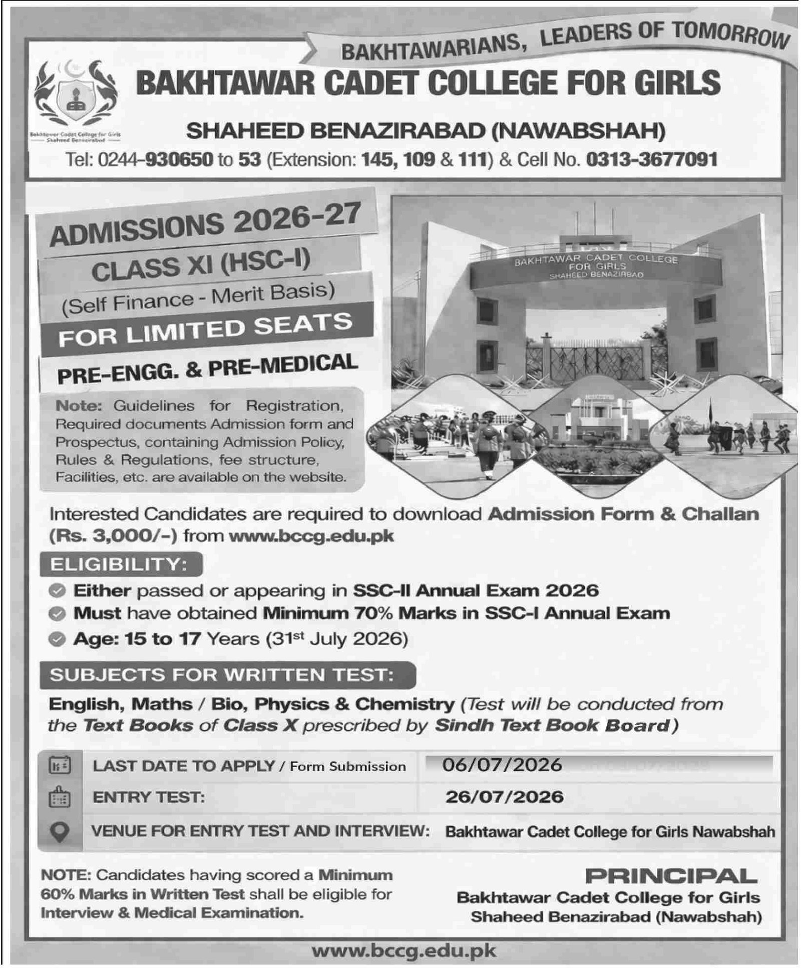 Admissions Open in Bakhtawar Cadet College for Girls 2026 announce the Contract career opportunities for the post of See Below Ad in Khyber Pakhtunkhwa, Peshawar for the fresh and experienced candidates on Contract basis who have Check Advertisement degree. Posted date of this post is 26/04/2026 and the last date is 09/05/2026. if you are eligible for this job apply before due date.