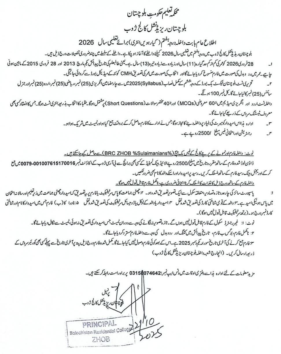 Balochistan Residential College Zhob announce the latest Admission in different programs, details are mentioned in See Below Ad . Students from Balochistan, Zhob and other provinces of Pakistan, can apply for the Admission. Students awaiting for the Admissions in Balochistan Residential College Zhob can apply according the given criteria which is mentioned in the advertisement. Students awaiting results may also apply. Advertisement date is 22/10/2025 and the last date of the admission is 01/12/2025