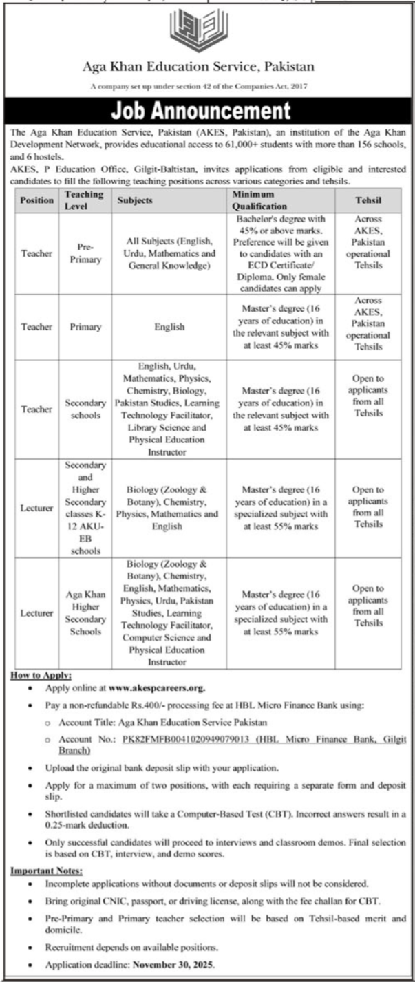 Aga Khan Education Services Gilgit Jobs 2025 announce the Contract career opportunities for the post of See Below Ad in Gilgit Baltistan, Gilgit for the fresh and experienced candidates on Contract basis who have Check Advertisement degree. Posted date of this post is 05/11/2025 and the last date is 30/11/2025. if you are eligible for this job apply before due date.