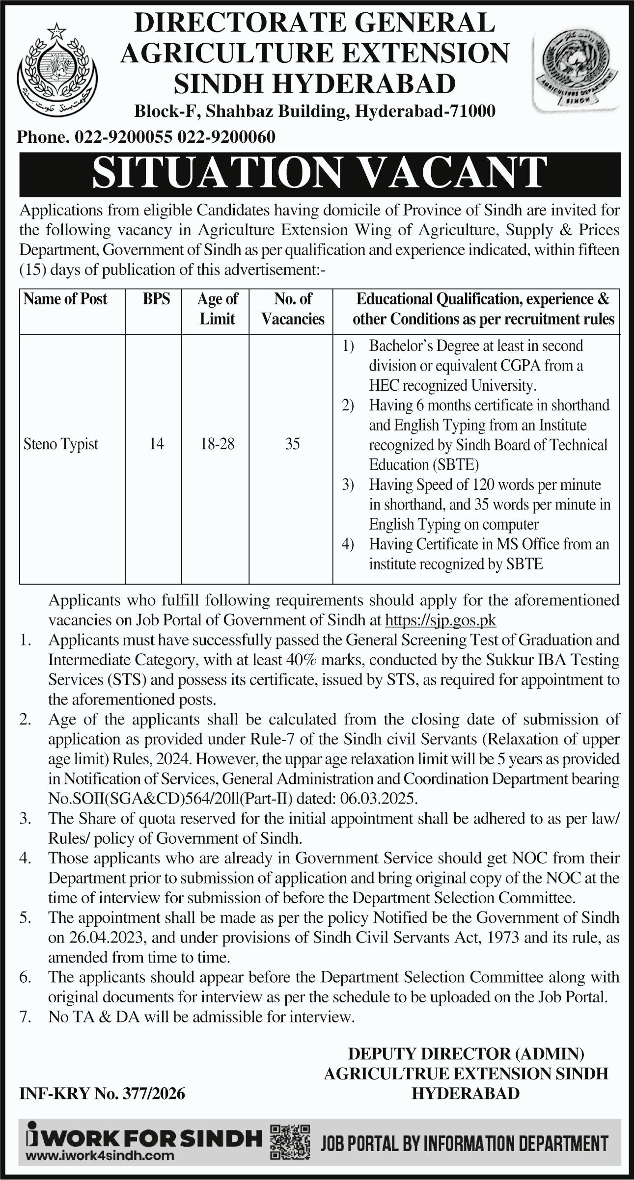 Agriculture Extension Sindh Hyderabad Job 2026 announce the Contract career opportunities for the post of See Below Ad in Sindh, Karachi for the fresh and experienced candidates on Contract basis who have Check Advertisement degree. Posted date of this post is 03/02/2026 and the last date is 18/02/2026. if you are eligible for this job apply before due date.
