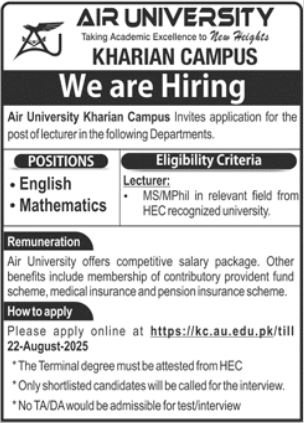 Air University Kharian Jobs 2025 announce the Contract career opportunities for the post of See Below Ad in Punjab, Kharan for the fresh and experienced candidates on Contract basis who have Check Advertisement degree. Posted date of this post is 17/08/2025 and the last date is 22/08/2025. if you are eligible for this job apply before due date.