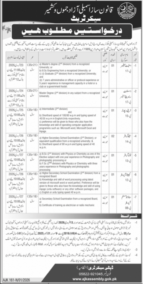 AJK Legislative Assembly Muzaffarabad Jobs Notice 2026 announce the Contract career opportunities for the post of See Below Ad in Azad Jammu Kashmir, Muzaffarabad for the fresh and experienced candidates on Contract basis who have Check Advertisement degree. Posted date of this post is 29/01/2026 and the last date is 13/02/2026. if you are eligible for this job apply before due date.