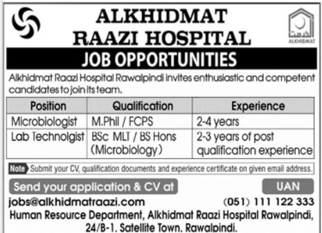 Al Khidmat Raazi Hospital Rawalpindi Jobs 2025 announce the Contract career opportunities for the post of See Below Ad in Punjab, Rawalpindi for the fresh and experienced candidates on Contract basis who have Check Advertisement degree. Posted date of this post is 10/08/2025 and the last date is 27/08/2025. if you are eligible for this job apply before due date.
