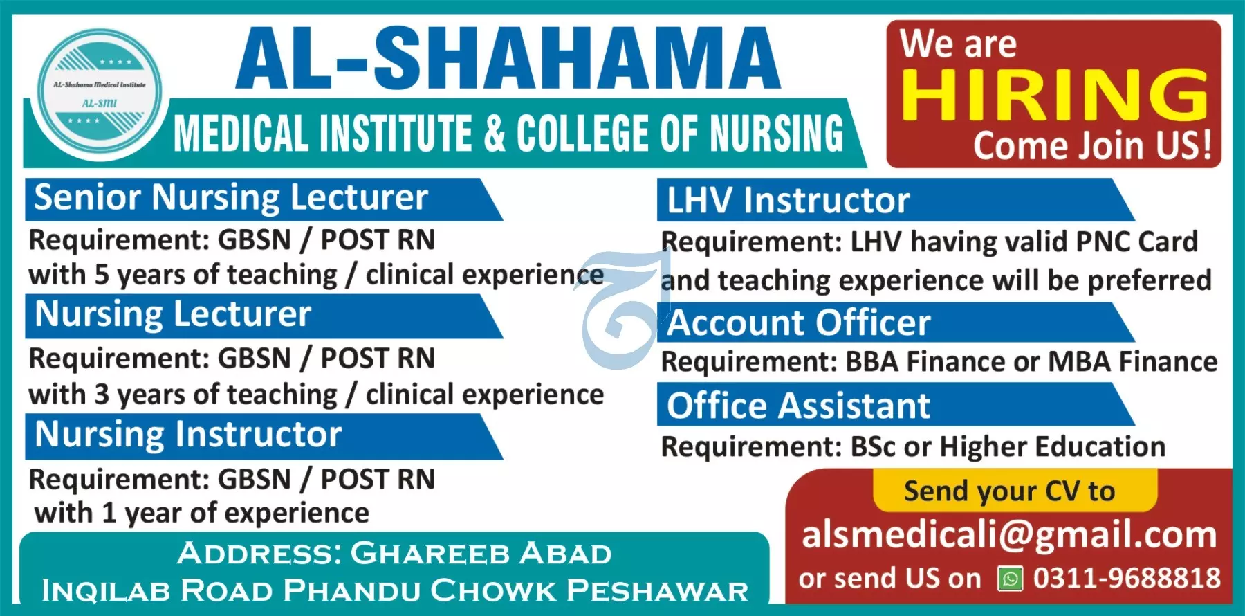 Al Shahama Medical Institute Peshawar Jobs 2023 announce the Contract career opportunities for the post of See Below Ad in Khyber Pakhtunkhwa, Peshawar for the fresh and experienced candidates on Contract basis who have Check Advertisement degree. Posted date of this post is 27/09/2023 and the last date is 27/10/2023. if you are eligible for this job apply before due date.