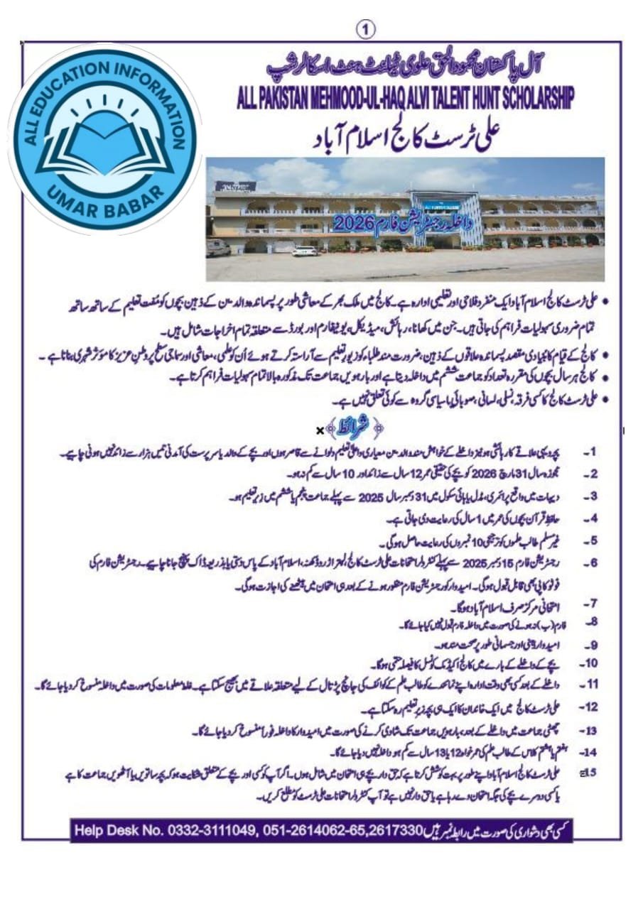 Ali Trust College Islamabad announce the latest Admission in different programs, details are mentioned in See Below Ad . Students from Federal, Islamabad and other provinces of Pakistan, can apply for the Admission. Students awaiting for the Admissions in Ali Trust College Islamabad can apply according the given criteria which is mentioned in the advertisement. Students awaiting results may also apply. Advertisement date is 30/10/2025 and the last date of the admission is 31/12/2025