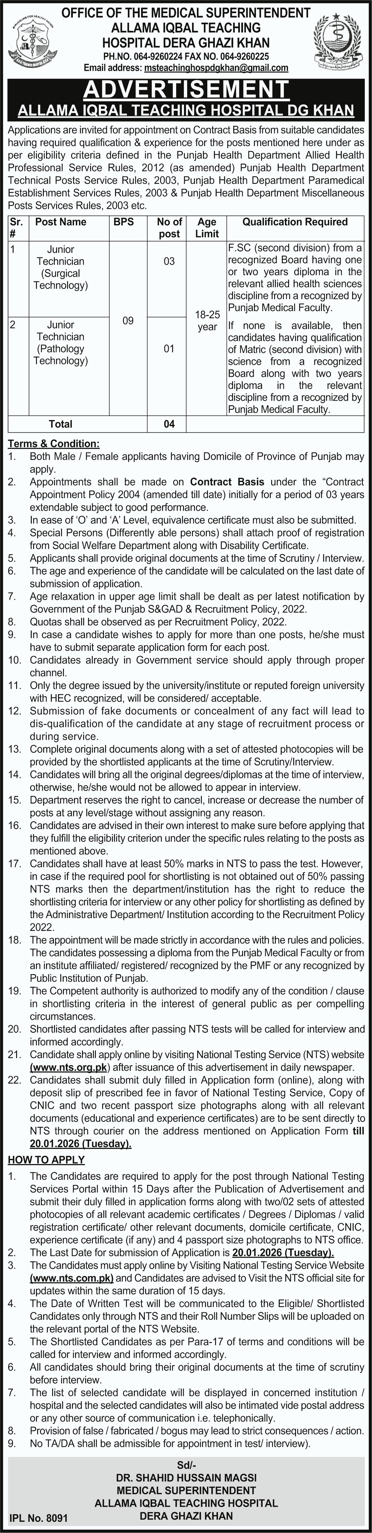 Allama Iqbal Teaching Hospital Dera Ghazi Khan Jobs 2026 announce the Contract career opportunities for the post of See Below Ad in Punjab, Dera Ghazi Khan for the fresh and experienced candidates on Contract basis who have Check Advertisement degree. Posted date of this post is 31/12/2025 and the last date is 20/01/2026. if you are eligible for this job apply before due date.