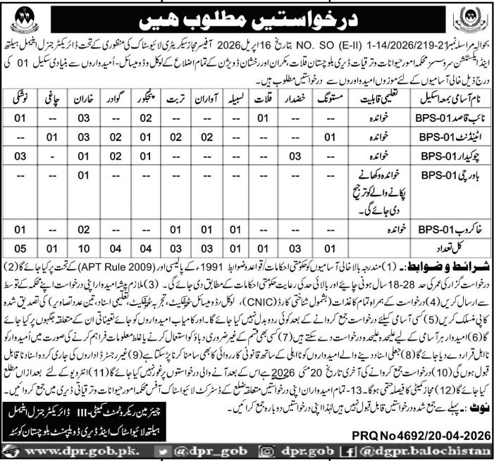 Animal Health Livestock & Dairy Development Balochistan Jobs announce the Contract career opportunities for the post of See Below Ad in Balochistan, Quetta for the fresh and experienced candidates on Contract basis who have Check Advertisement degree. Posted date of this post is 21/04/2026 and the last date is 20/05/2026. if you are eligible for this job apply before due date.
