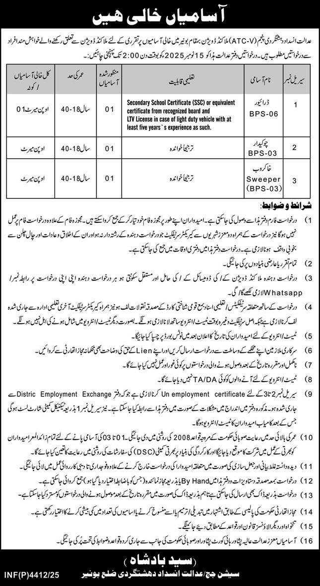 Applications are invited from interested candidates belonging to Malakand Division for appointments to vacant posts in the Anti-Terrorism Court-V (ATC-V), Malakand Division at Buner. Applications must reach the office of this court by 2:00 PM on November 15, 2025.