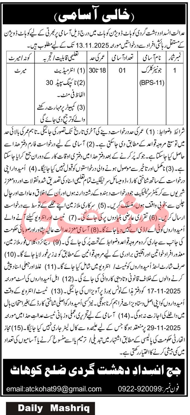 Applications are invited from permanent residents of Kohat Division for recruitment to the following post in the Anti-Terrorism Court, Kohat Division, until November 13, 2025.