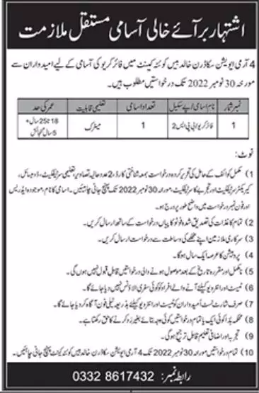 Army Aviation Quetta Cantt jobs 2022 announce the Permanent career opportunities for the post of See Below Ad in Balochistan, Quetta for the fresh and experienced candidates on Permanent basis who have Check Advertisement degree. Posted date of this post is 14/11/2022 and the last date is 30/11/2022. if you are eligible for this job apply before due date.